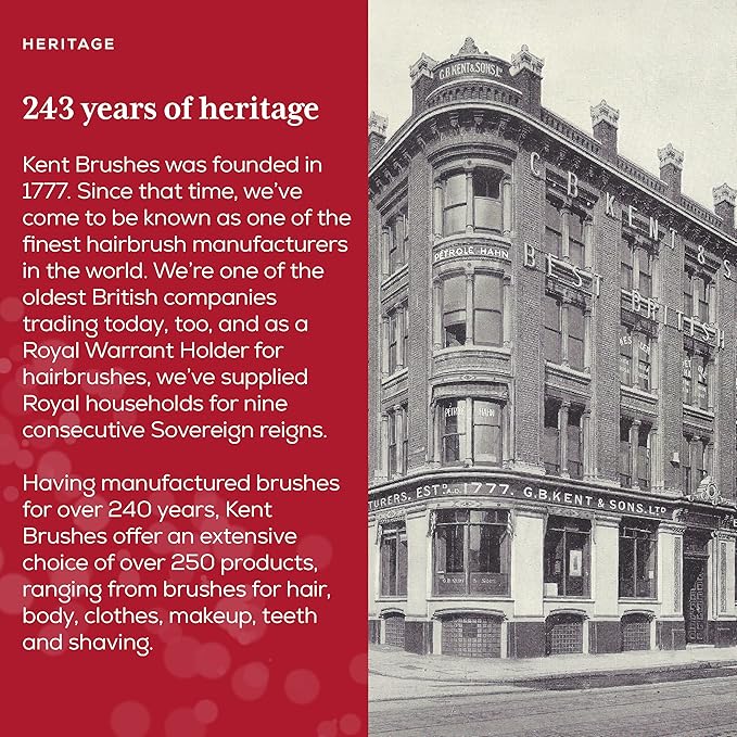 - ROYALLY RECOGNIZED SINCE 1777: Kent started out as G. B. Kent & Sons PLC back in 1777 as a family owned business. Today, Kent is the world's oldest brush manufacturer as well as one of the oldest companies in Great Britain. Proudly displaying the Royal Warrant of Her Majesty the Queen, Kent continues to make high-quality products; including hair brushes, combs, makeup brushes, body brushes, shaving brushes, and clothing brushes. Experience the quality that has continued for 240 years.