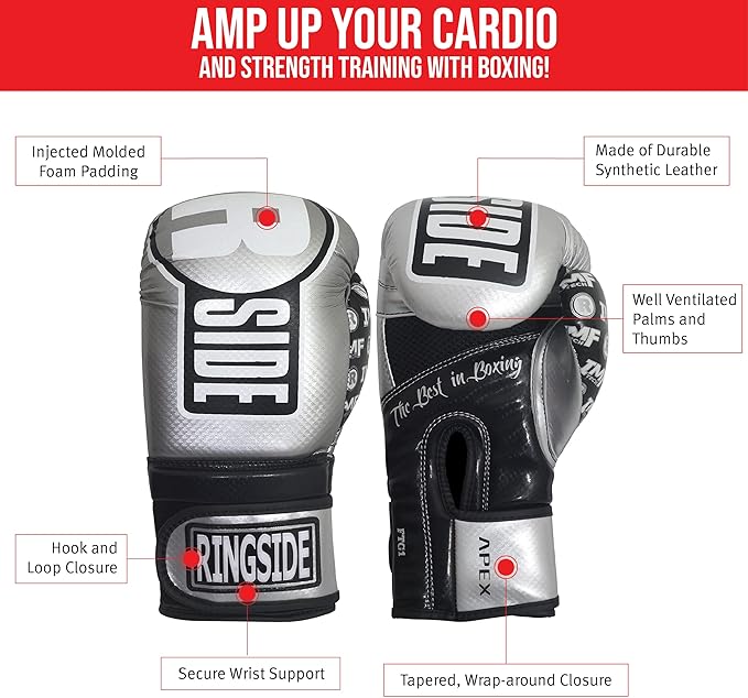 - Boxing Gloves: Fight your way to the top with Ringside’s Apex Boxing Bag Gloves. These durable synthetic leather gloves will help you push your body to the limit every time and allow you to reach your fitness and athletic goals.