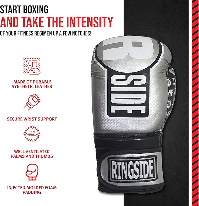 - Boxing Gloves: Fight your way to the top with Ringside’s Apex Boxing Bag Gloves. These durable synthetic leather gloves will help you push your body to the limit every time and allow you to reach your fitness and athletic goals.
