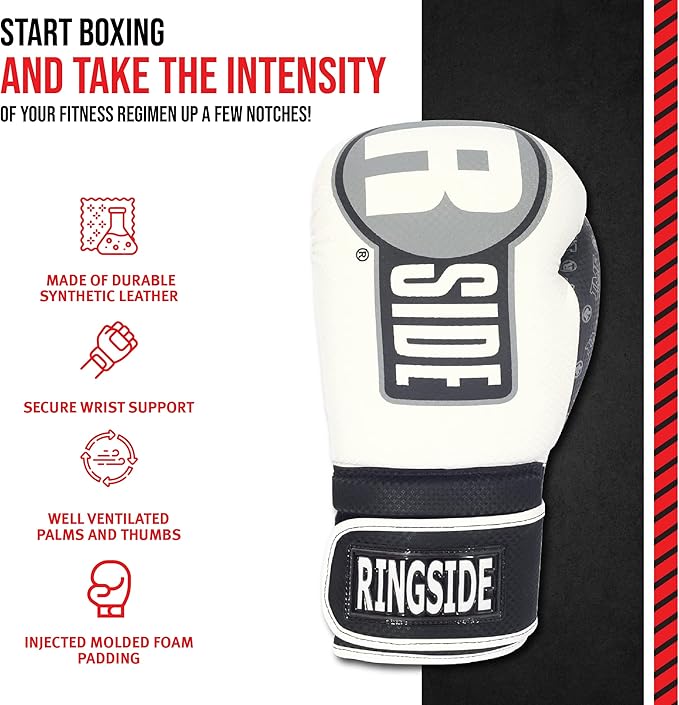 - Boxing Gloves: Fight your way to the top with Ringside’s Apex Boxing Bag Gloves. These durable synthetic leather gloves will help you push your body to the limit every time and allow you to reach your fitness and athletic goals.