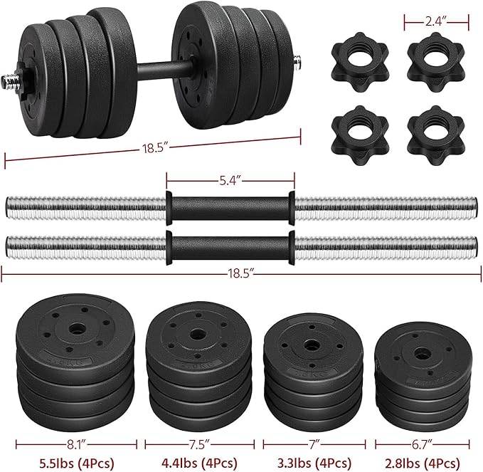 - Adjustable weight: Customize it to your ideal exercise intensity! Our dumbbells have 16 weight plates in 4 different weights, 4 pieces for each weight, and 2 spinlock collars make the adjustment easier