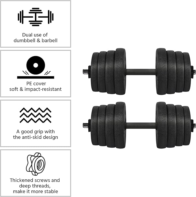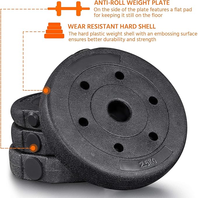 - Selected material for better durability: This 30kg dumbbell set is constructed of cement weight plate covered with hard plastic and electroplated iron dumbbell bar. Antirust and water-resistant materials provide you with a long use life