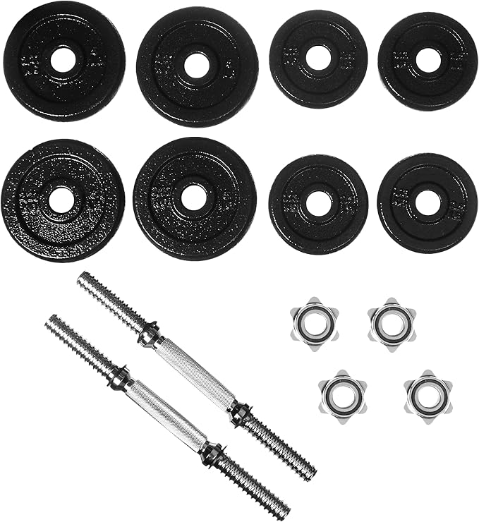 - Set of 2 dumbbells (38 pounds total weight): TWO 3-pound dumbbell handles, FOUR 2.5-pound plates, FOUR 5-pound plates, and FOUR 0.5-pound collars