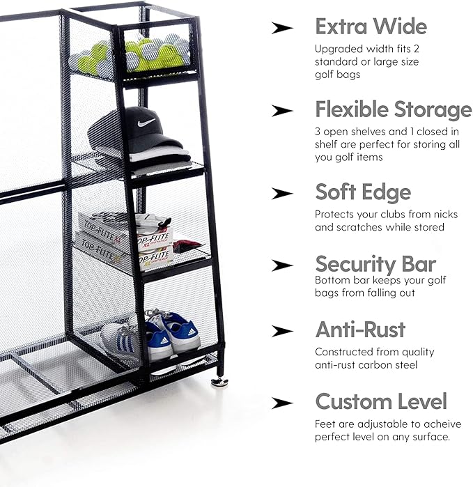 - Extra Roomy - main compartment has been upgraded to 26 inches long to fit 2 standard or large size golf bags! 3 open shelves for your medium sized gear, and 1 closed in shelf for your small loose items.