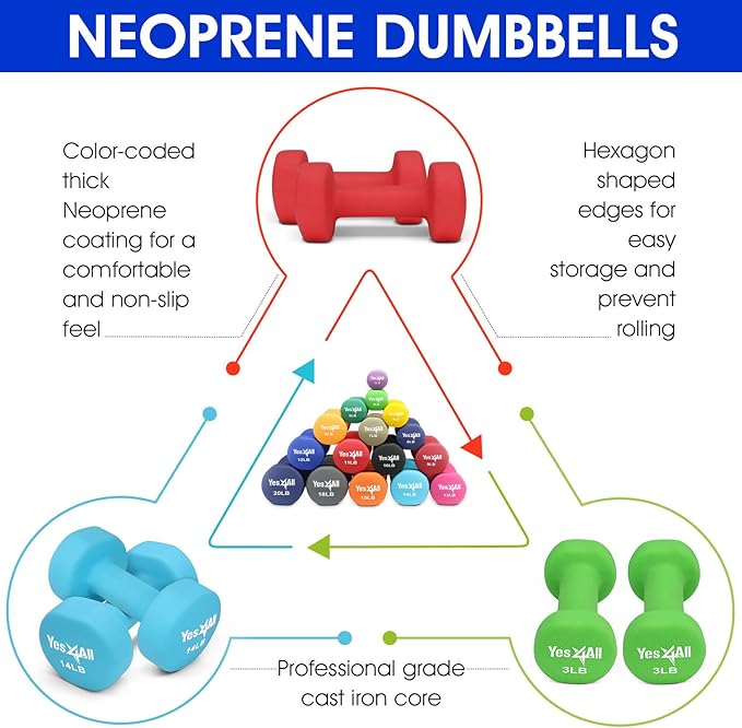 - GREAT FOR TOTAL BODY WORKOUT: Yes4All Neoprene Dumbbells are ideal to sculpt your arms, shoulders & back, build stamina & speed up metabolic rate. Perfect for overall health, balance, weight management, aerobics, cardio, yoga, and strength-building