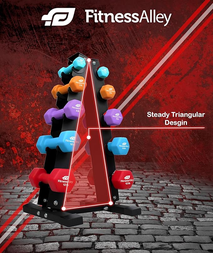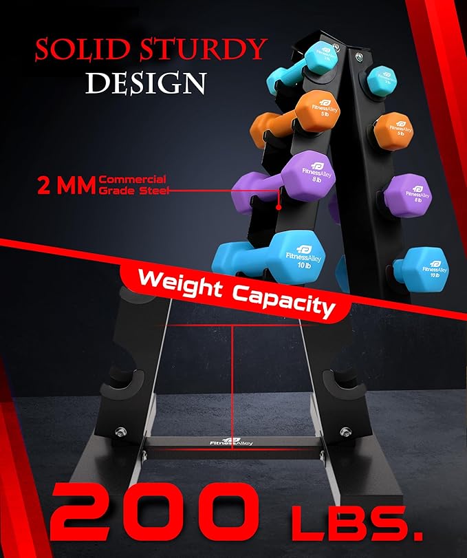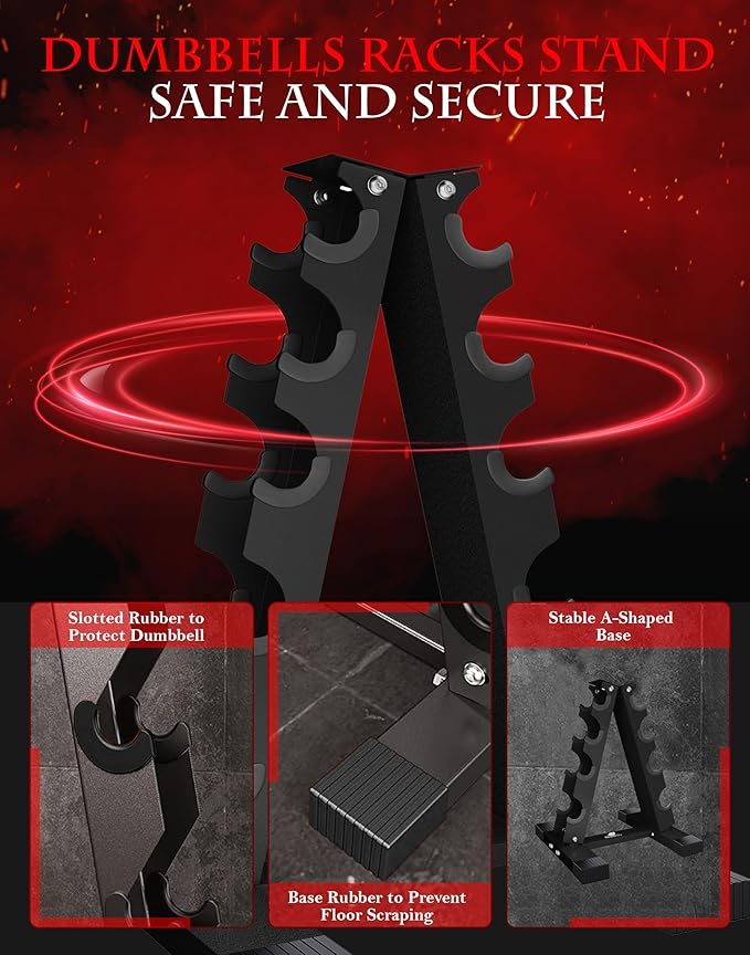 - The A shape dumbbell racks having 2MM thickness in construction, scratch less structure and solid firm design that allows rack to stand still without any slippage from foot