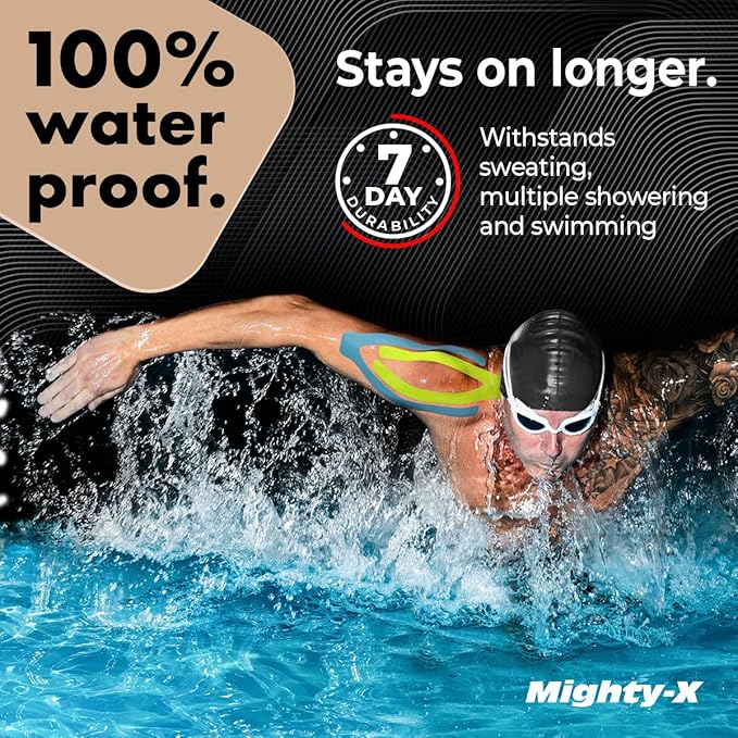 - 100% WATERPROOF – Mighty-X knee tape for knee stability is designed to withstand heavy sweating and multiple showers. The nylon kinesiology tape waterproof material doesn’t absorb moisture and dries quickly, so you can get back to your routine right after a shower.