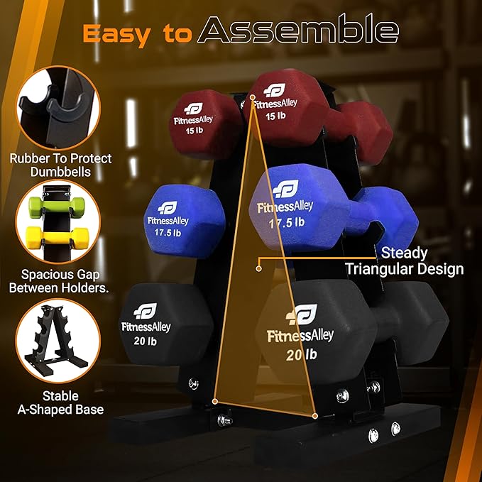 - The “A” shape dumbbell racks having 2mm thickness in construction, scratch-less structure and solid firm design that allows the rack to remain still without any slippage. Exotic Hex shape structure of the dumbbells prevents the dumbbells from rolling away