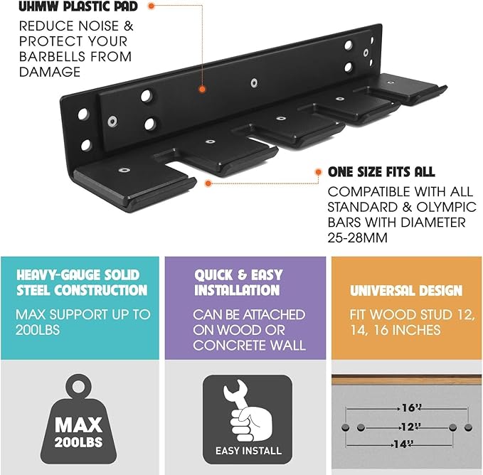 - Heavy capacity load: strong construction can withstand up to 200 pounds. Just simply secure it in place, you can store both long & short bars, including Olympic weightlifting bars, power bars, curl bars, cambered bars, and more