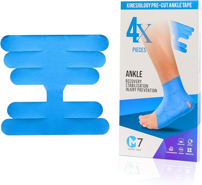 M7 Sport Kinesiology Ankle Tape for Ankle Sprain and Injury Recovery, Pain Relief Therapeutic Tape, Ankle Brace Compression Support, Plantar Fasciitis, Waterproof, Eases Swelling (Blue, 4-Pack)