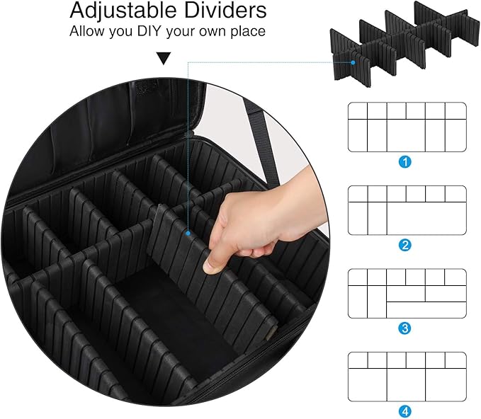 - ADJUSTABLE COMPARTMENTS: This Makeup Bag have several compartments and makeup brushes slots, you can keep your makeup tools is neat and tidy. Special design adjustable compartments, you can adjust as needed.