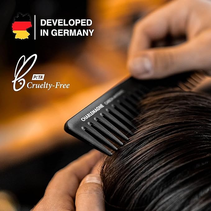 - German Craftsmanship: Elevate your grooming game with the Charlemagne Carbon Hair Comb, a true barber comb designed with precision. This carbon fiber comb offers durability and sophistication, making it essential for the modern man's grooming routine