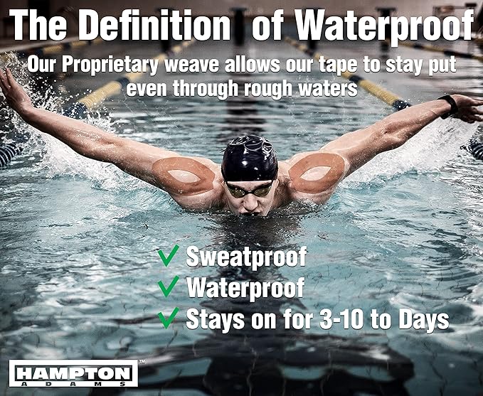 - SLEEP ON IT - Our muscle tape has a proprietary Second Skin Technology that is free of latex and rubber that bothers sensitive skin. No matter what you do, this sports tape stays put for several days without irritating your skin or leaving behind a sticky residue. Its synthetic material is stretchy, comfortable, and easy to apply. It’s also water and sweat proof. Use it for medical, therapeutic, or sports-related purposes.