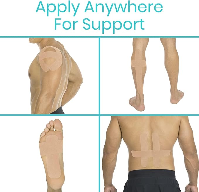 - STABILIZING SUPPORT FOR ANY ACTIVITY: Allowing a full range of motion, the Vive kinesiology tape provides targeted support to sore muscles and weak joints. The sports tape stabilizes joints and muscles to relieve pain and minimize the risk of injury during workouts, sporting events and daily activities. Ideal for running, weight lifting, crossfit and yoga, applying sports tape helps to relieve knee pain, shin splints, plantar fasciitis, shoulder pain, carpal tunnel and more.