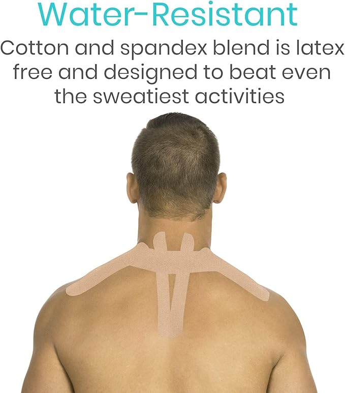- FLEXIBLE WATER-RESISTANT TAPE: Water and sweat-resistant, the Vive kinesiology tape is constructed with a durable fabric blend. Strong, yet flexible, the cotton and spandex blend is latex-free, lightweight and breathable for greater comfort.