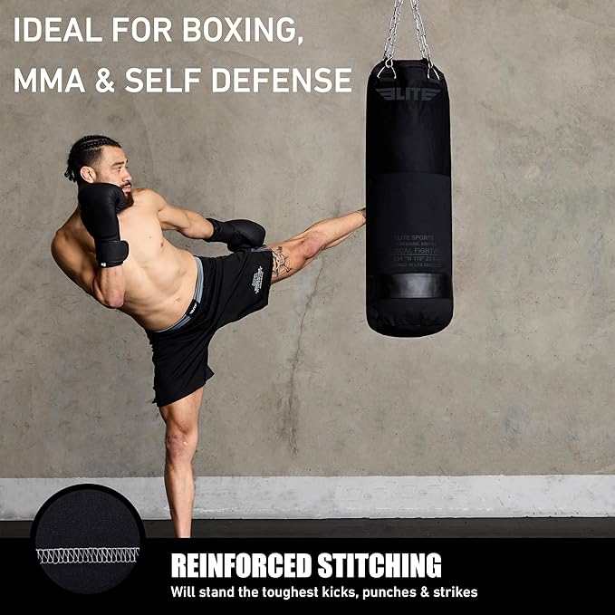 - ✅ DURABLE – Elite Sports canvas punching bag is made from highly durable canvas and strong reinforced stitching. It comes with heavy-duty metal chains and attachment. Push yourself hard and break the limits with our punching bag and stay fit.
