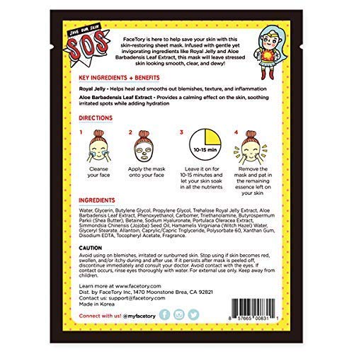 FACETORY K Beauty Face Mask Skin Care - SOS SAVE OUR SKIN RESTORING Sheet Mask with Royal Jelly & Aloe | De-Stress, Calm Inflammation, Dewy Skin (10 Pack)