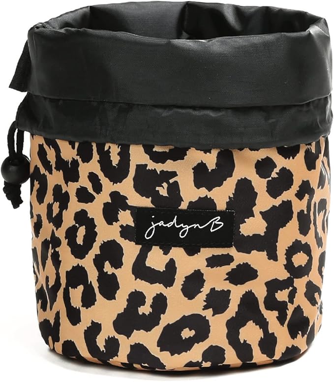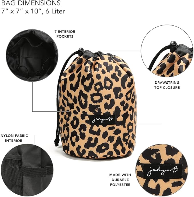 Jadyn Durable Cinch Top Makeup Organizer - Compact Travel Makeup Bag - 7 Interior Pockets for Cosmetics - Drawstring Toiletry Travel Bag for Women - 6L Storage Capacity - (Leopard)
