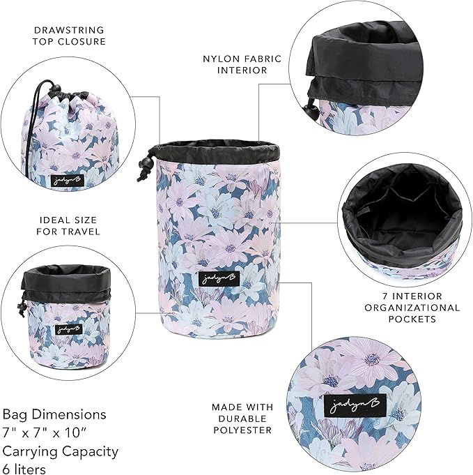 Jadyn Durable Cinch Top Makeup Organizer - Compact Travel Makeup Bag - 7 Interior Pockets for Cosmetics - Drawstring Toiletry Travel Bag for Women - 6L Storage Capacity - (Blooming Daisy)