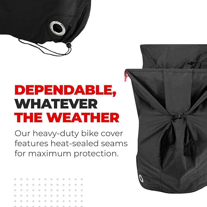 - Secure Fit and Lock Compatibility: Features a lock-hole for added security; adjustable buckle strap and toggle fit ensure this outdoor bike cover stays in place even on windy days