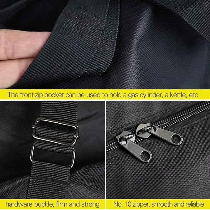 - The front zip pocket with reflective silver logo, eye-catching security, it can be used to hold a gas cylinder, a kettle ,etc.