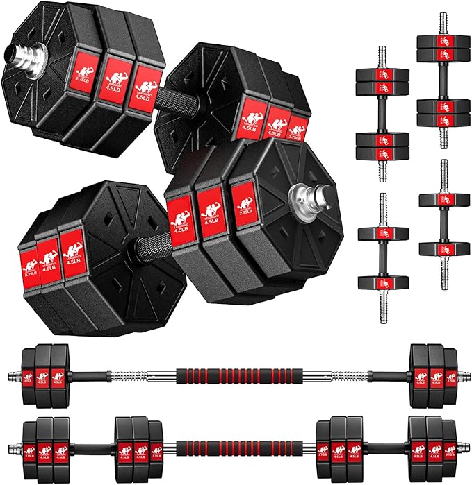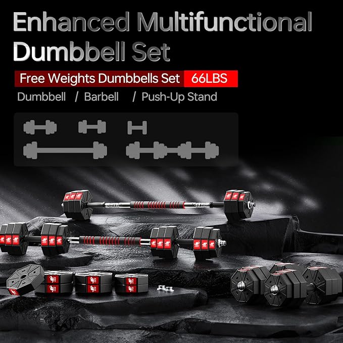 - ✅【3 in 1 DUMBBELL SET】: This adjustable dumbbell set total weights are 66pounds. You can adjust the weight of the dumbbell according to your needs. The dumbbell is equipped with a connecting rod. You can convert it into a barbell in a few seconds, which can meet the exercise needs of upper and lower limbs. Helps to tone and shape the arms, shoulders, back and strengthen your muscles. Multifunctional strength training equipment provides a better training method than any other sports equipment.