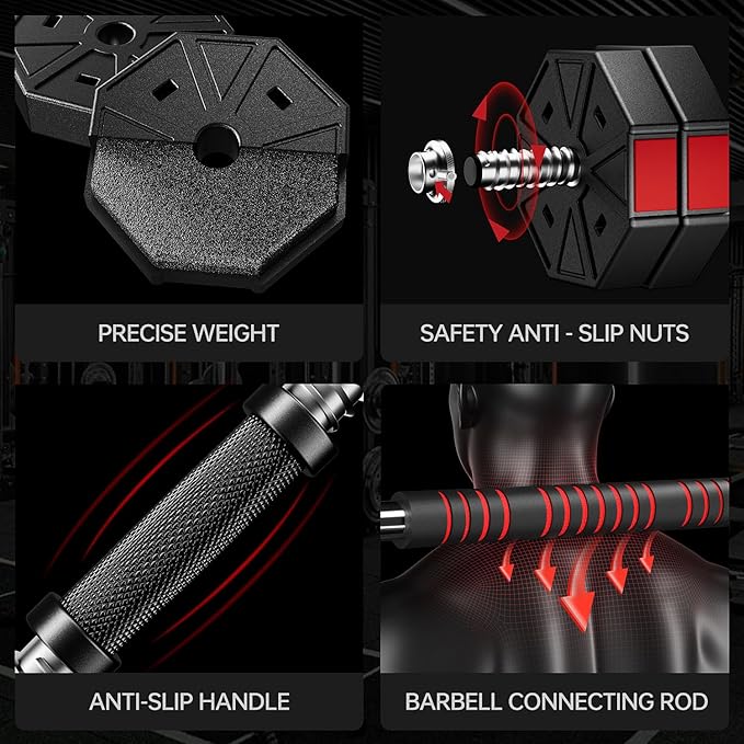 - ✅【SAFE and DURABLE】:This adjustable 3 in 1 dumbbell set is made of durable PE material. Unlike iron dumbbells, it will not scratch the floor. It is very safe and durable. The octagonal design of the Dumbbell plates can prevent it from rolling, More stable. And we upgraded the nut, installed non-slip screws, double fixed, more secure.