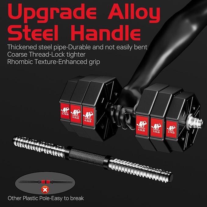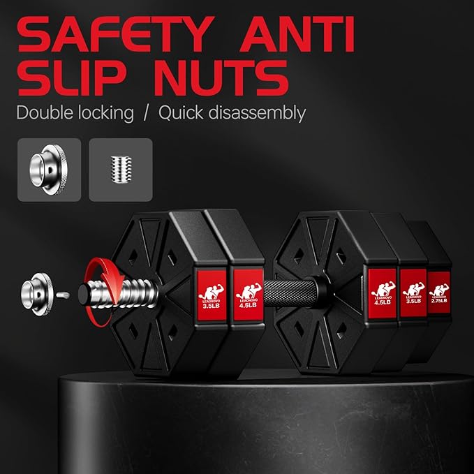 - ✅【SAFE and DURABLE】:This adjustable 3 in 1 dumbbell set is made of durable PE material. Unlike iron dumbbells, it will not scratch the floor. It is very safe and durable. The octagonal design of the Dumbbell plates can prevent it from rolling, More stable. And we upgraded the nut, installed non-slip screws, double fixed, more secure.