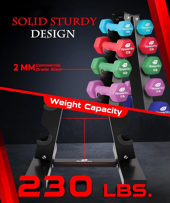 - Having capacity of 230 LB neoprene dumbbells storage, racks provides rubber clips on each holder over which any weight from 2lb to 20lb can be stored with ease