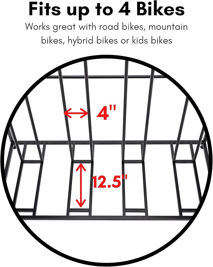 - VERSATILE BIKE STORAGE: Securely holds up to 4 bicycles upright without wall hooks, ideal for garages, homes, and outdoor use. Ideal for road, mountain, hybrid, electric, and kids' bikes.