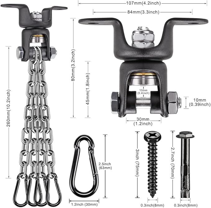 - 🥊WHAT YOU GET: 1 punching bag hanger with chain, 4 Chains, 4 carabiners and 2 Hexagon Wood Screws. If you have any questions about this swing hanger, or there is a problem with the product quality. Please contact us and we will give you a satisfactory solution within 12 hours.