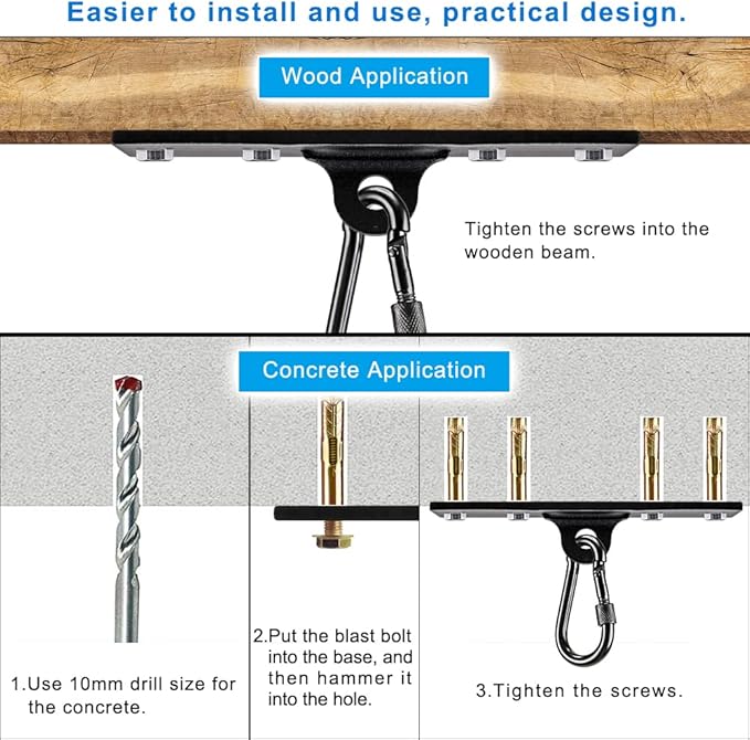 - 🥊EASY TO INSTALL: Includes 4 Hexagon Wood Screws. There are four holes in the base of the swing hanger, use screws to fix the wooden beams through the holes. It is recommended that you pre-drill four holes in the wooden beam during installation, so that it is easier to tighten the screws. A unique one piece design and can be installed in minutes.