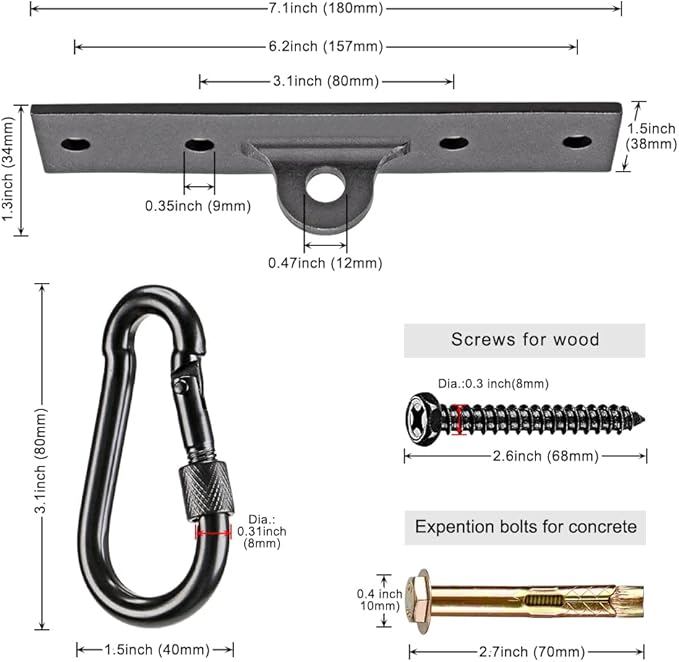 - 🥊WHAT YOU GET: Recommended for Ages 12+. Heavy Duty Swing hanger, 1 carabiners,4 Hexagon Wood Screws and 4 expansion tubes. If you are dissatisfied with any reason, please feel free to contact with us. Keeping you satisfied and providing you with the friendliest customer service is our number one goal. Better products, and the best in customer satisfaction. US Patent Pending. All Rights Reserved.