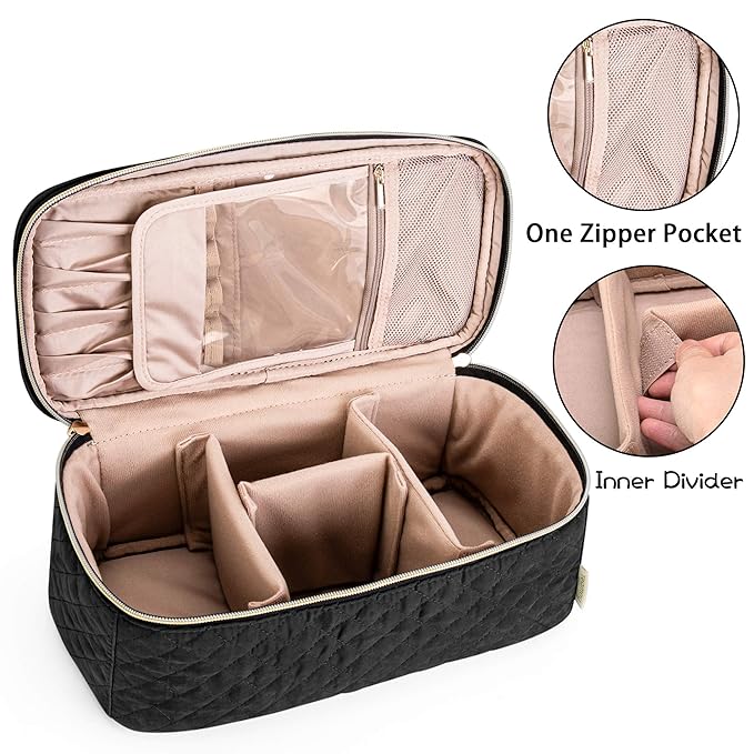 - LARGE CAPACITY: The main section with detachable dividers could be adjusted to carry your various makeup needs, like lipstick, Pressed powder, eyeliners, etc.. Padded foam on all sides for excellent protection.
