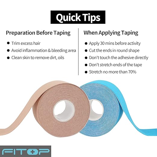 - Comfortable & Waterproof: Breathable and moisture-wicking fabric substrate, suitable for shower. The acrylic-based adhesive with water wave design allows moisture to flow easily from the taped area. FITOP physio tape lets you devote yourself to sports training.