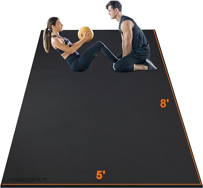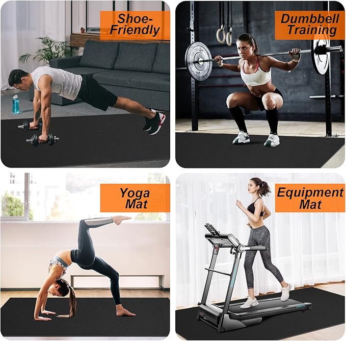 - ✅EXTRA-LARGE HOME GYM MAT COVERS 40 SQUARE FEET: The 8’x5’x7mm large fitness mat instantly transforms any space into a professional gym, giving you and your partners more than enough room to workout on without feeling cramped, and the floor mat is even shoe-friendly, whether you’re doing cardio, yoga, weightlift, dance workout including P90x, MMA, TAM, insanity, T25, Zumba, TRX, kettlebell, jumping rope or need large mats to install underneath a treadmill or weight bench, try this exercise mat.