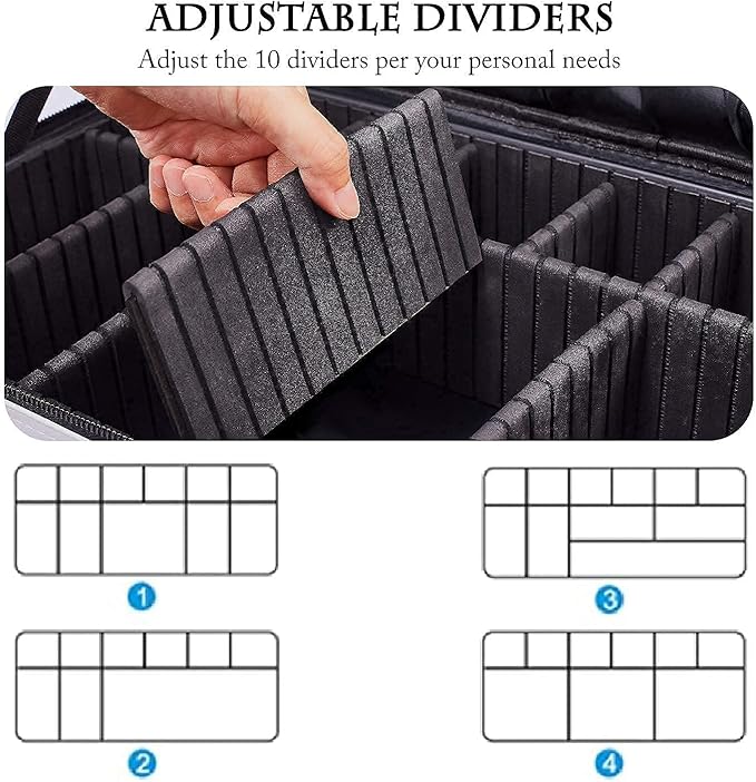 - Adjustable Compartments: This makeup bag has 10 adjustable EVA dividers and 12 makeup brushes slots. You can design the internal compartments by adjusting the dividers to fit different cosmetics and keep them perfectly separated and organized.