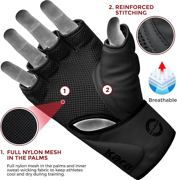 - EXPERIENCE UNMATCHED DURABILITY – RDX’s MMA gloves are your dependable training partner, offering unmatched durability when mastering the art of grappling and takedowns. These padded MMA gloves, constructed from rugged ConvEX Skin Maya Hide leather, are designed to endure and enhance your every punch and move. Whether you're preparing for an MMA bout, honing your Muay Thai skills, or practicing for any other combat sport, you deserve gear that's just as tough as you are.