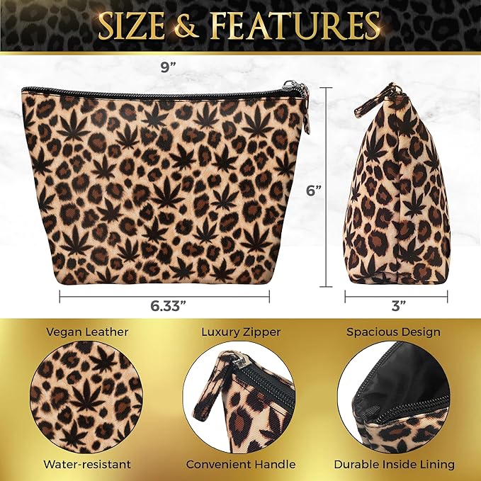 - 💄 LARGE CAPACITY - This spacious 9” x 6” inch makeup pouch has a widened 3” base for storage of all your makeup, cosmetic, toiletry, and girly stuff for women. Roomy travel design can be used as a school supplies pencil bag for back to school and off to college. This cute cosmetic bag is perfect for all your matching leopard print accessories and cute accessories for women.