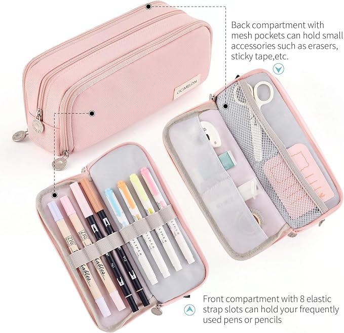 CICIMELON Large Capacity Pencil Case 3 Compartment Pouch Pen Bag for School Teen Girl Boy Men Women (Pink)