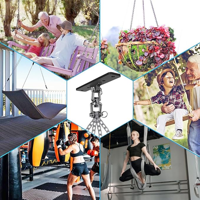 - 🥊360°+180°: 360° swivel+180° swing set hook creating a wider range of using like hanging heavy boxing punching bag, playgrounds swing set, porch swings, hammock chairs, indoor swing and so on.