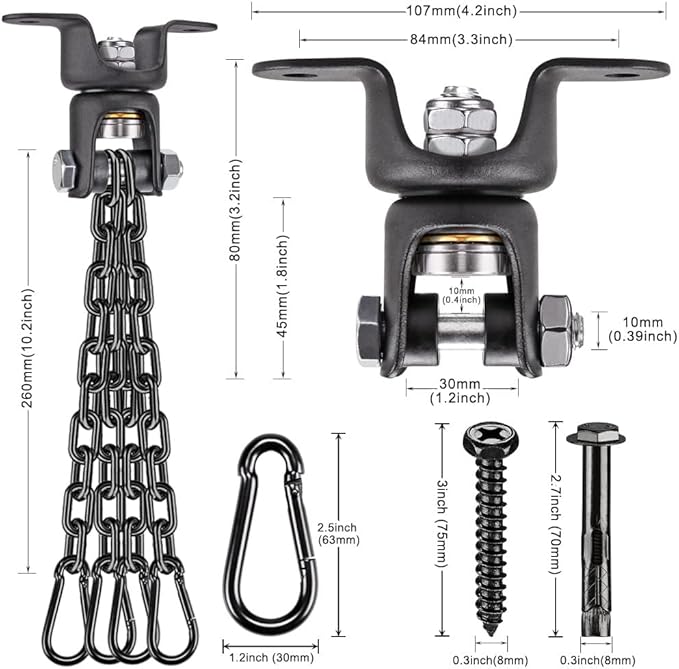 - 🥊WHAT YOU GET: 1 punching bag hanger ceiling mount with chain, 4 Chains, 4 carabiners and 2 Hexagon Wood Screws. If you have any questions about this swing hanger, or there is a problem with the product quality. Please contact us and we will give you a satisfactory solution within 12 hours.