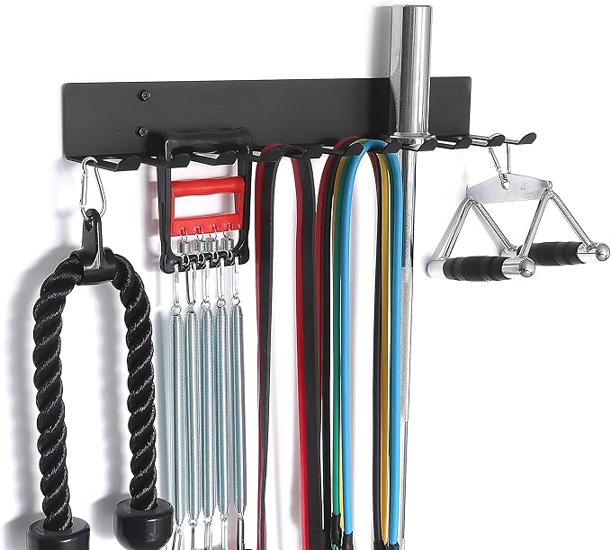 - Heavy-duty- The resistance band hanger is made of heavy-duty steel, the surface is covered with black anti-rust powder coating to make it strong and beautiful. It can be used to store fitness equipment in home gyms, garages and commercial gyms. It is recommended to use a specific storage rack for Olympic Barbells of 6ft and above