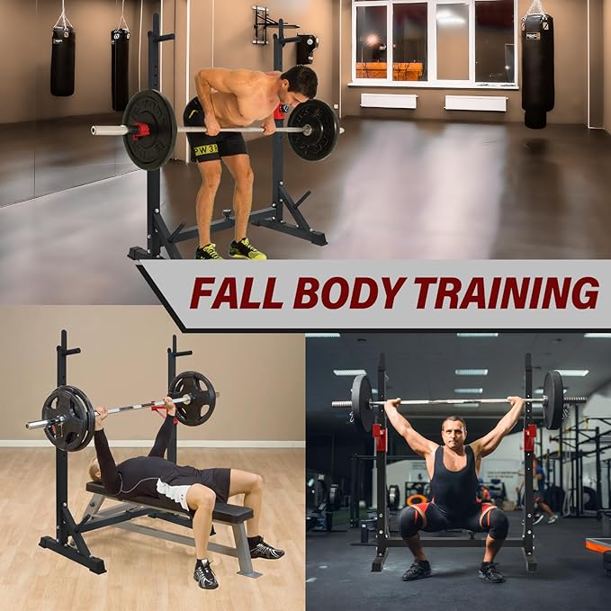 - Multi-Functional Design: Our versatile squat rack is designed for various occasions, allowing you to effortlessly engage in a wide range of training exercises, including bench press, shoulder press, squat, overhead lifts, bar exercises, dips, pull-ups, push-ups, leg raises, and more. Experience the ultimate workout versatility with our multi-functional design.