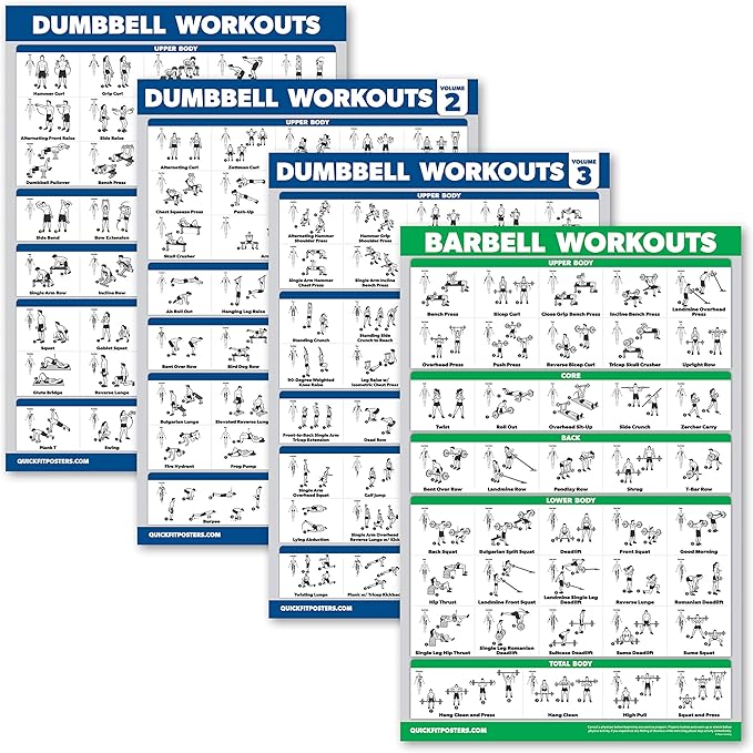 Palace Learning 4 Pack - Dumbbell Workout Posters Volume 1, 2 & 3 + Barbell Exercise Chart - Set of 4 Posters (LAMINATED, 18" x 24")