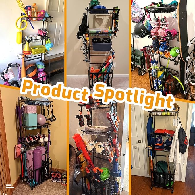- 【Multipurpose Rolling Sports Organizer】 Use it as a ball storage rack in garage, a kids toy organizer in home, a sports gear display shelf in the sport store. It can help to tidy up and organize space, let you get rid of clutters at once.