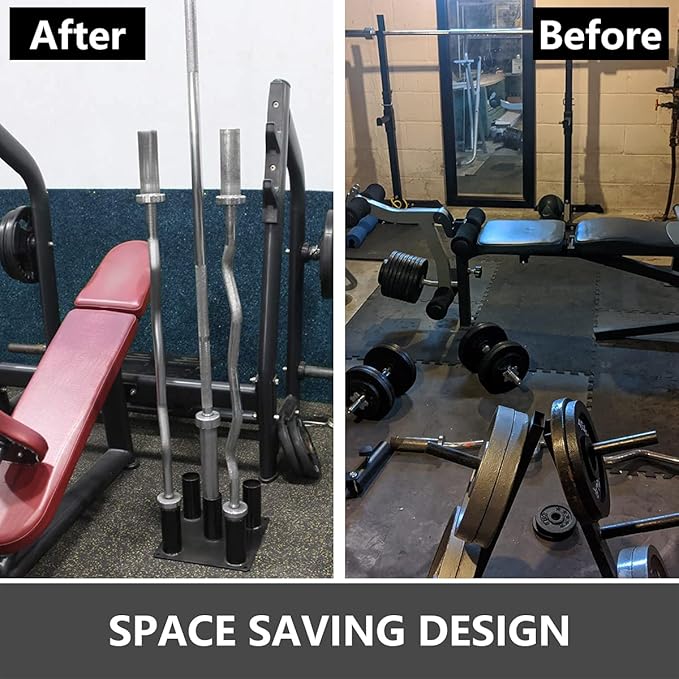 - 【SPACE SAVING DESIGN】 The barbell storage holder is a great idea for anyone who's looking for a bar holder that layout takes up little space. Its compact design helps organize the messy barbells bars, make you enjoy a tidy exercise environment.