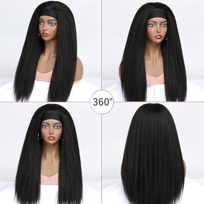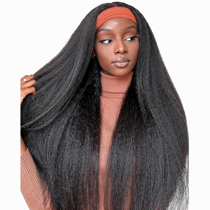 30 Inch Kinky Straight Wig Human Hair 180% Density 12A Kinky Straight Human Hair Headband Wigs for Black Women Yaki Straight Human Hair Wigs with Headband Attached Half Wig Natural Black Color