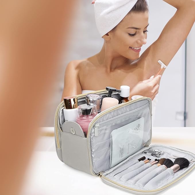 - 【Versatile and Stylish】 The custom durable handle is designed for easy carrying, and the strong metal fittings ensure that every detail is exquisitely made. The unique design of our bag allows you to integrate your toiletry bag, storage bag, and makeup bag into one, making it perfect for daily use or travel. It's a great gift for moms, wives, girlfriends, and daughters, as every woman deserves a beautiful and practical travel makeup bag.