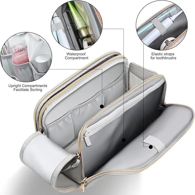 - 【Premium Quality Material】 The surface material of our Travel Toiletry Bag is crafted with fashionable lychee skin, which not only looks great but is also highly waterproof. The interior is lined with water-resistant nylon, which prevents moisture from seeping in and keeps your belongings dry. Our bags are designed to be stylish, waterproof, and easy to clean, ensuring that they will last you for many trips to come.